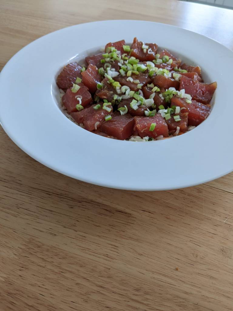 Dans une assiette creuse ou un bol versez la riz pour recouvrir complètement le le fond. Recouvrir le riz avec les morceaux de thon pour cacher complètement le riz. Enfin versez une petite poignée d’oignon verts et service immédiatement.