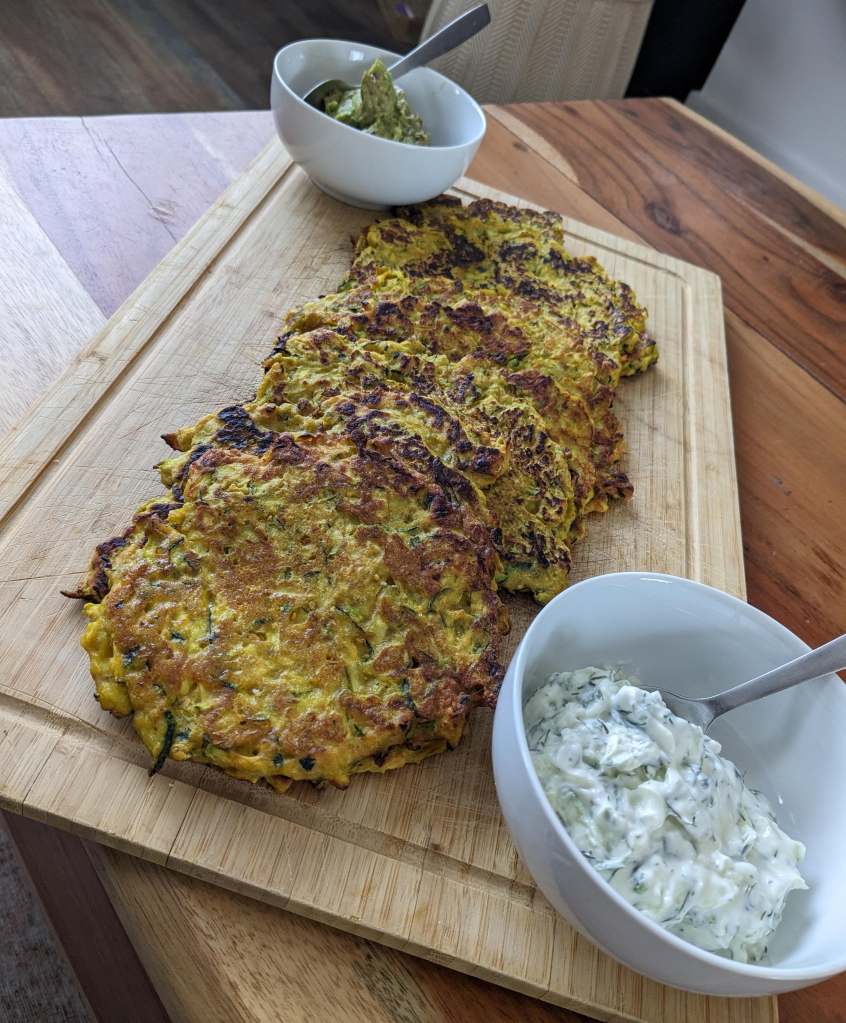 Rappez les courgettes avec une rappe a fromage et sans éliminer l’eau ajouter tous les ingrédients: Sel, Farine, Poivre, Poudre d’ail et curry.